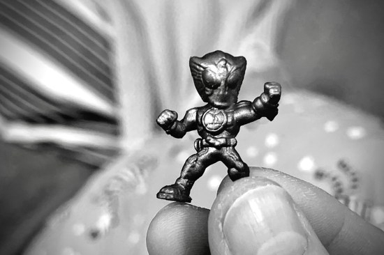 In Kirby’s Badekugel war eine Figur «eingebacken». Das schaut aus wie ein Kamen Rider sagte ich noch zu ihm als sie auftauchte, und bei genauer Inspektion stellte sich heraus, es ist tatsächlich einer: Kamen Rider OOO in der TaToBa Form! Muss in einem Lagerhaus einiges liegen geblieben sein, dass man als «Weltraum Held» verkaufen kann.